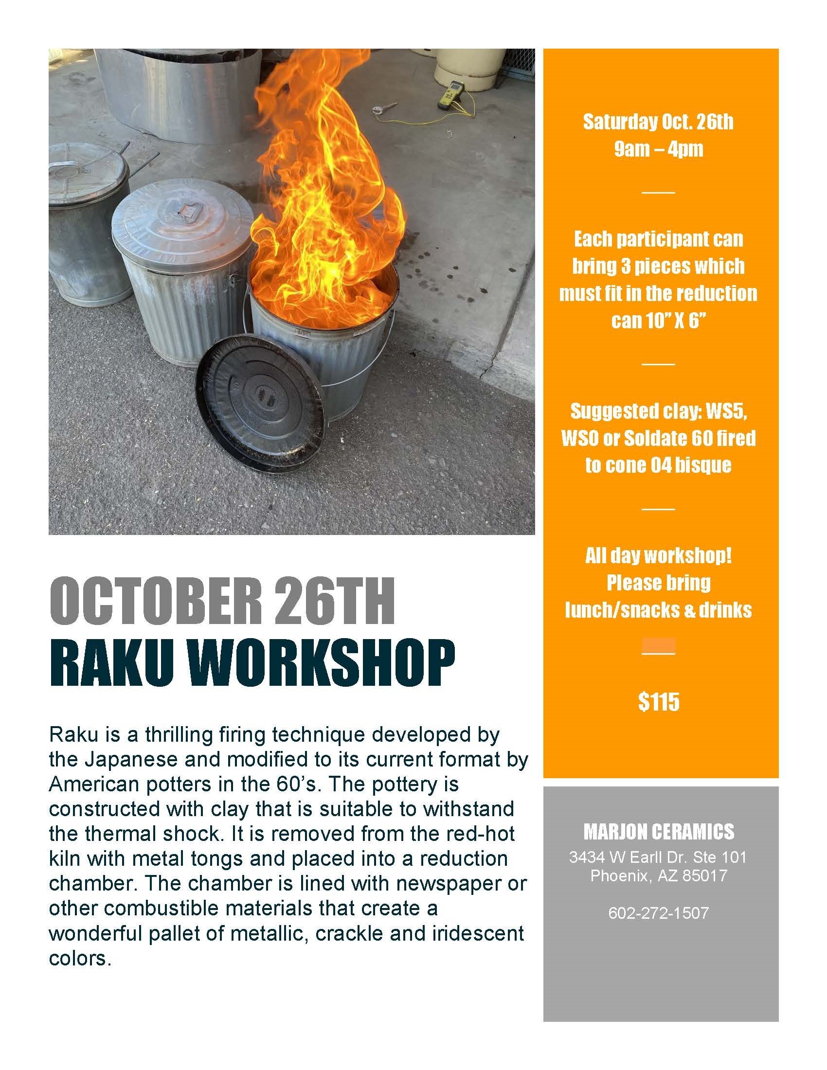 | Nov 23rd | 9:00am-4:00pm | Raku Workshop | $115.00 |
