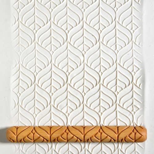 The Long Hand Roller is a texture roller for clay artists. The roller is deeply carved, has a unique design, and releases well from clay.